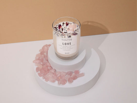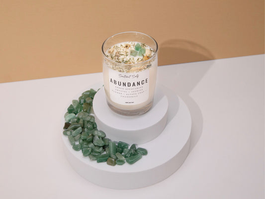 - Placement: Ensure that herbs and crystals are embedded safely within the candle wax, if you do notice herbs or crystals near the wick feel free to remove them.